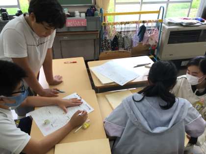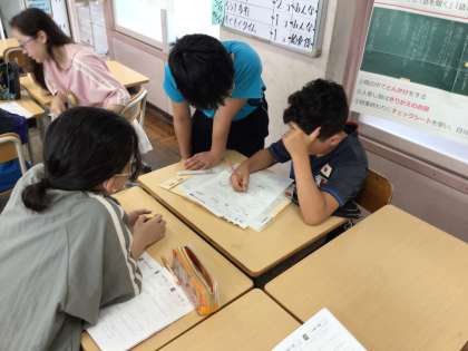 6年算数では、文字の式、分数✖️整数、分数➗整数の単元のテストが返却され、間違えたところや解き方がわからないところを互いに教え合っていました。