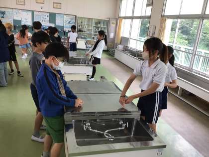 5年生初めての調理実習はゆでる調理の学習です。「青菜のおひたし」と「ゆでいも」の作り方とポイントを学びました。調理室で調理実習の動きを確認し、来週の調理実習に備えました。初めての調理実習が楽しみですね。