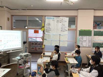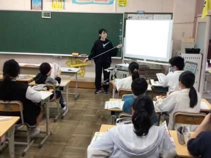 6年外国語では、日常生活について友達と紹介し合おうのところを学習しています。スクリーンに映し出した絵について英語で何というか確認をし、発音練習をしていました。