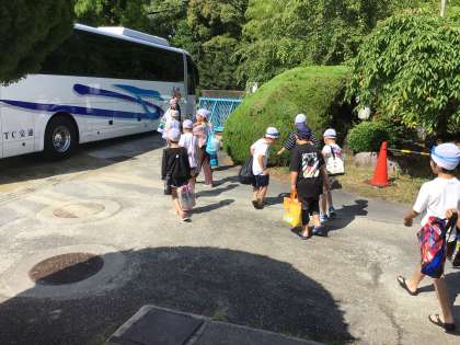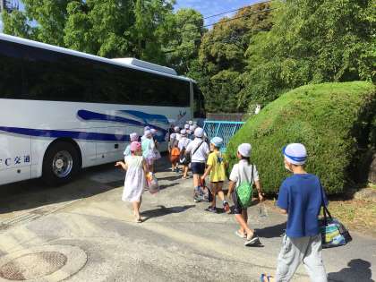 2年生は、今日から水泳学習で、スイミングスクールに行きます。朝、着替えをし、「行ってきます」と大きな声で言いながら、バスに乗り込みました。