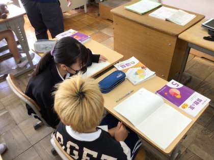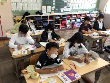 5年算数では、小数のわり算について学習を進めていました。復習問題の後、0.7m、1.05kgの鉄棒の1m分の重さを求める問題に取り組んでいました。個人で式を考えた後、ペアで意見交換をしていました。