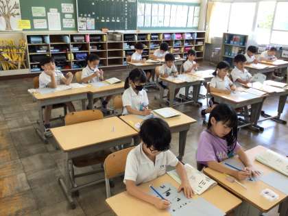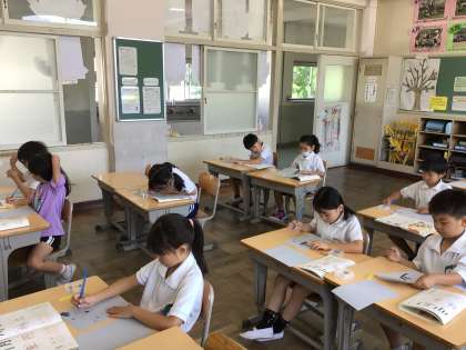 6/5 2年生書写 公開日 2025/06/05 更新日 2025/06/05 各学年から 2年生書写では、「水筆」を使って水書の学習をしました。書き順に気をつけて、「はらい」「とめ」の練習をしました。「はらい」は、難しく、何度も練習をしました。みんな集中して書くことができています。
