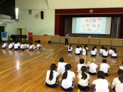 5限体育館で5年生を対象に応急手当講習を行いました。中消防署の方を含め6名の方に来校していただき,救急車が到着するまでの間、継続して胸骨圧迫をすることや、AEDの使い方について学びました。