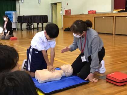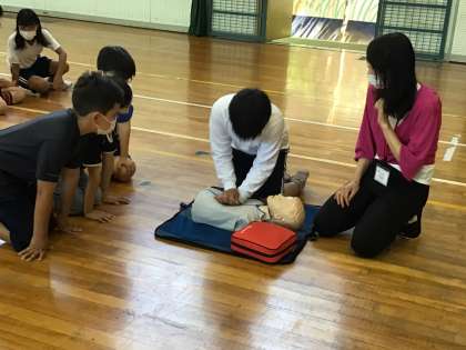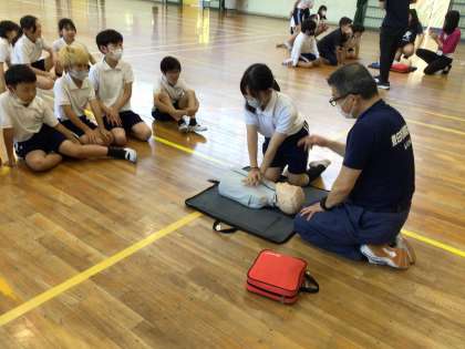 応急手当講習の様子です。説明動画を見た後、参加した5年生全員が胸骨圧迫の練習をしました。
