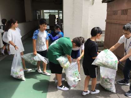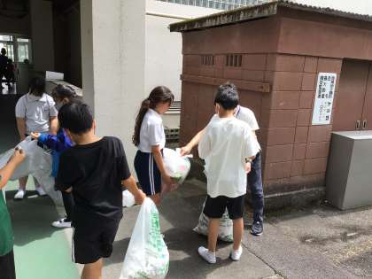 美化委員会の常時活動の1つとして、ゴミ回収があります。毎週金曜日の清掃の時間に各教室やトイレなどのゴミ箱をまわり、ゴミを回収していきます。集めたゴミはゴミ倉庫前で1つの袋にまとめていきます。自分の役割をきちんと果たす高学年の姿がいいですね。