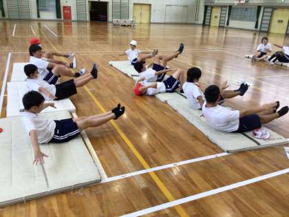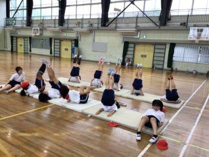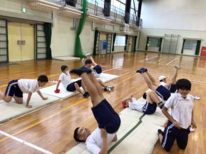 6年体育のマット運動の様子です。ブリッジなど基本的な技を練習していました。