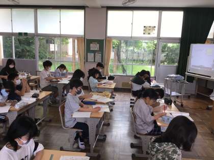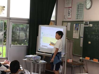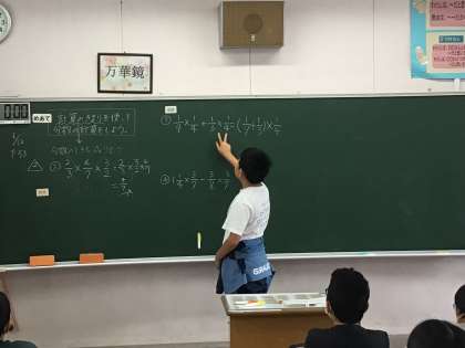 6年算数では、分数のかけ算などを学習しています。「計算のきまりを使って分数の計算をしよう」というめあてで、整数のときと同様に計算のきまりを使って計算ができることを前で説明していました。類似問題をさっそく解いていました。