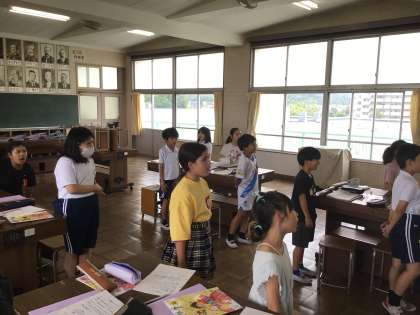 6/13 3年音楽1 公開日 2025/06/13 更新日 2025/06/13 各学年から 3年音楽では、「校歌」「ハッピーソング」「ドレミで歌おう」「海風きって」を歌いました。またリズム練習の一環として茶つみの手遊びもやりました。