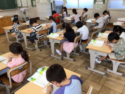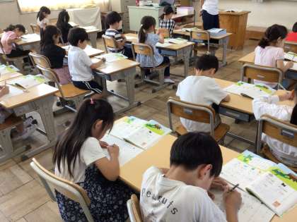 1年生国語では小さい「つ」のつく言葉を学習しています。今日は、プリントに「せっけん」「ねっこ」「きって」「まっしろ」などの言葉を書きました。