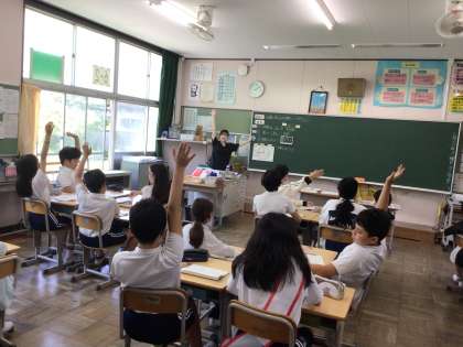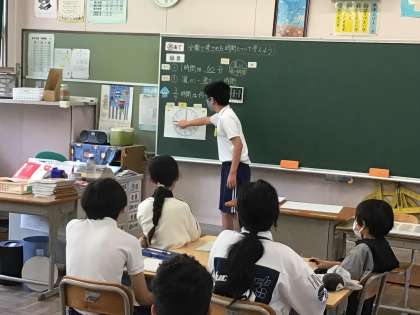 6年算数では、「分数で表された時間について考えよう」というめあてで学習を進めていました。子どもたちにとって苦手な部分ですが、班で考え方を話し合いながら求めていました。