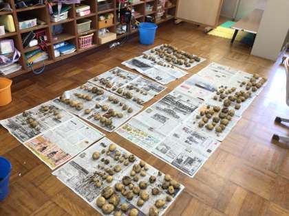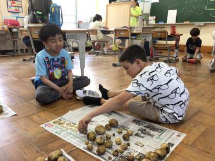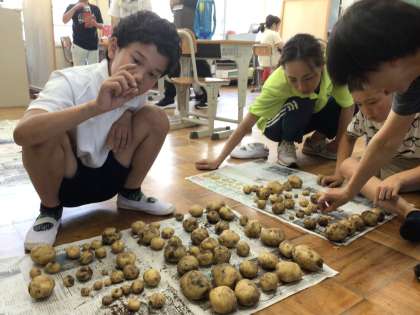6/18 7・8組生単 公開日 2025/06/18 更新日 2025/06/18 各学年から 7・8組で大切に育ててきたじゃがいもを収穫しました。大小さまざまですが、かなりの数です。みんなで協力していくつ収穫できたか数え、それぞれの個数を計算して求めていました。