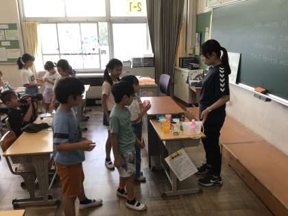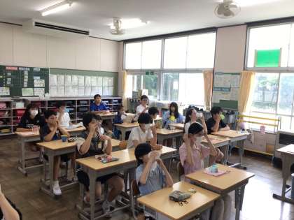 毎週金曜日の朝はフッ化物洗口です。リズミカルな曲に合わせてブクブク口内洗浄を行いました。