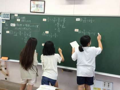 6/20 6年算数1 公開日 2025/06/20 更新日 2025/06/20 各学年から 6年算数では、分数➗分数の単元の学習をしています。「帯分数や整数のわり算の仕方を考えよう」というめあてで学習をしていました。計算問題を解くスピードもはやくなってきましたね。