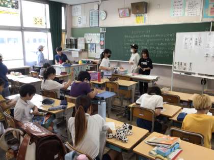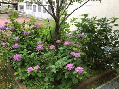 どんより曇空のもと、いつも通り登校してきました。中庭のアジサイもきれいに咲いています。エアコンの効いた教室で、朝の支度が始まりました。