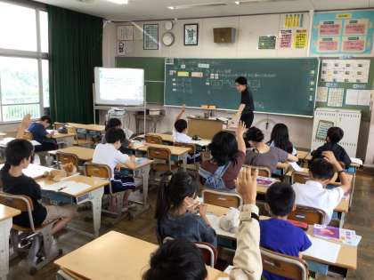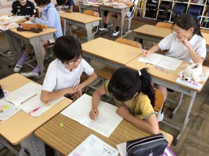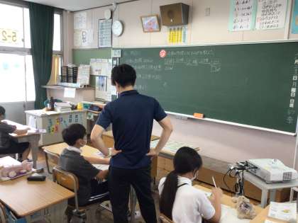 5年算数は少人数で割合の単元を学習しています。「全体の何倍になっているか考えよう」というめあてで学習を進めていました。式が何を求めているのかをしっかり考えていました。