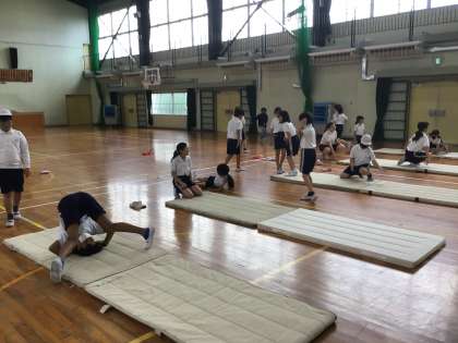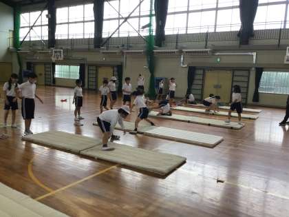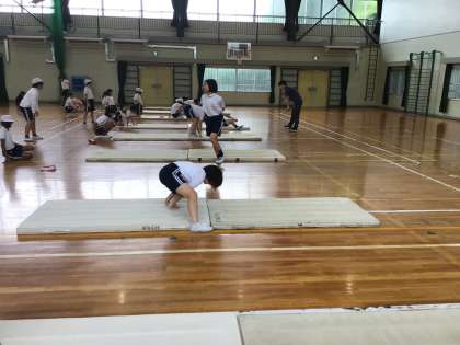 6/24 5年体育 公開日 2025/06/24 更新日 2025/06/24 各学年から 5年体育では、体育館でマット運動を行っていました。「倒立系の技に挑戦し、ポイントを見つけよう」というめあてで学習を進めていました。開脚前転や開脚後転を練習していました。