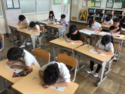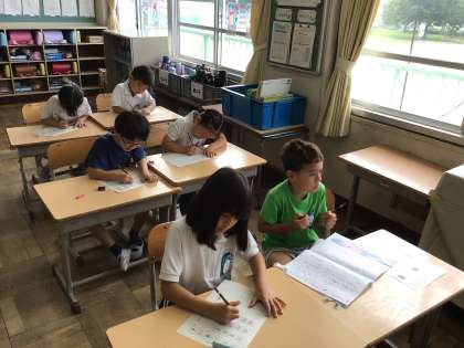 2年生書写では、今まで学習したことをプリントで復習しました。画と画の間に気をつけて書いたり、お手本をよく見て書いたりしました。