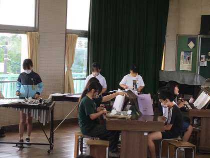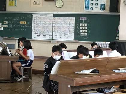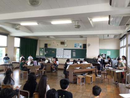 6年音楽の「ラバーズ コンチェルト」発表会の1組の演奏の様子です。互いの演奏を聴き合い、気づいたことや感想などを発表していました。