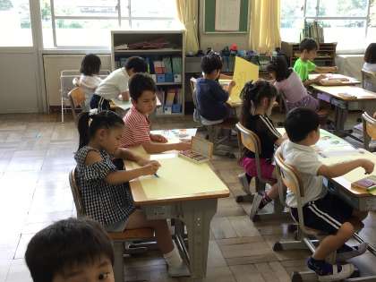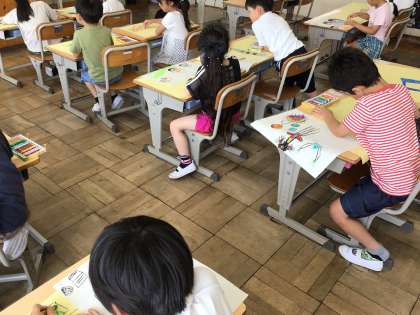6/27 1年生図工 公開日 2025/06/27 更新日 2025/06/27 各学年から 1年生図工では、学校でのできごとを色画用紙にクレヨンで描きました。遊んでいるところや、勉強しているところなど、自由に画用紙いっぱいに描きました。