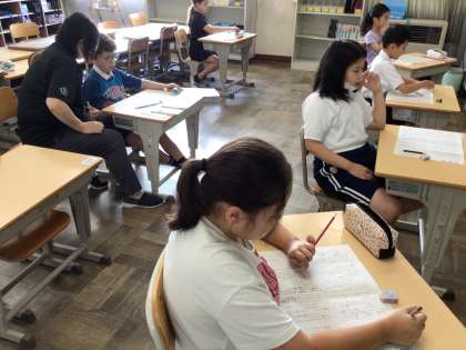 6/27 3年生国際学級 公開日 2025/06/27 更新日 2025/06/27 各学年から 3年生国際学級では国語の「物語を短くまとめて紹介しよう」のテストを行いました。文章を解説しながら、問題を解きました。