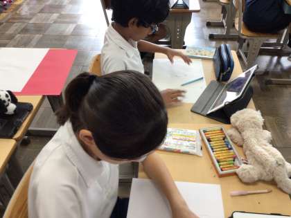 5年生図工では、画用紙に絵を描いて、学習用タブレットのアプリで撮影したものを動くようにするという作品をつくりました。自分が描いたものが動くことが楽しいですね。