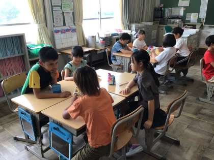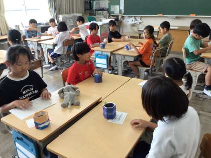 3年生図工では、「空き容器のへんしん」で作品を作りました。真っ白い紙の箱が、紙粘土をつかって、カラフルなすてきな箱になりました。今日は、グループで鑑賞をし、友だちの作品を褒めたり質問したりしました。