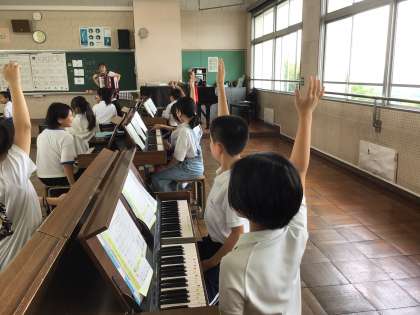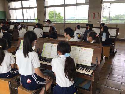 7/4 5年生音楽 公開日 2025/07/04 更新日 2025/07/04 各学年から 5年生音楽ではキャンプで歌う「燃えろよ燃えろ」「今日の日はさようなら」「遠き山に日が落ちて」等を歌ったり、オルガンで演奏したりしました。