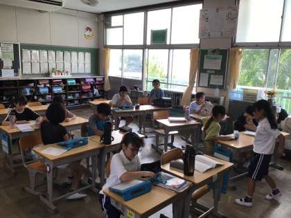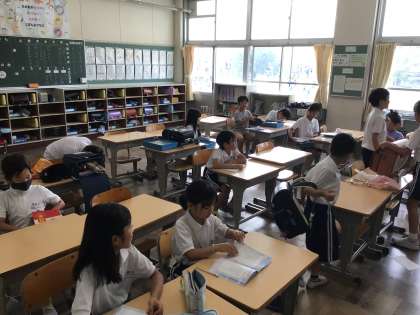 蒸し暑い中ですが、今日も元気よく登校してきました。友達と談笑しながら、朝の支度を急いでいました。