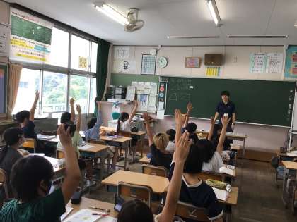 5年算数では、合同な図形の単元を学んでいます。三角形と四角形の内角の和についてそれぞれ復習を行った後、五角形や六角形といった図形を提示し、多角形という名前で呼ぶことを学習していました。「三角形や四角形を見つけて、多角形の角の大きさの和を考えよう」というめあてで学習を進めていました。
