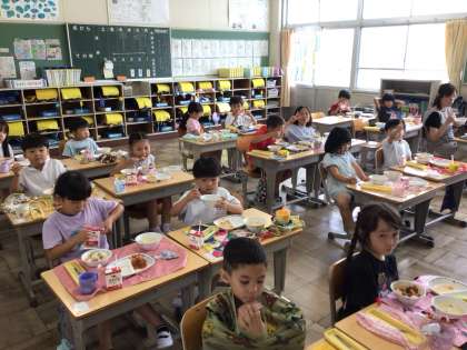 7/9 楽しい給食 公開日 2025/07/09 更新日 2025/07/09 特別活動 今日の給食は、タコライス、牛乳、豆3スープです。 タコライスは沖縄県のご当地料理です。タコスの具材をご飯の上にのせて食べます。 上手に混ぜて食べることができていました。