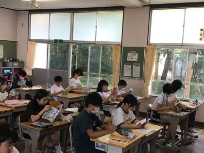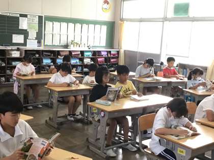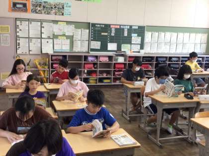 エアコンの効いた教室で静かに読書が始まりました。朝の支度が早くできている子はチャイムがなる前から読書をしています。落ち着いた雰囲気で一日がスタートできていますね。