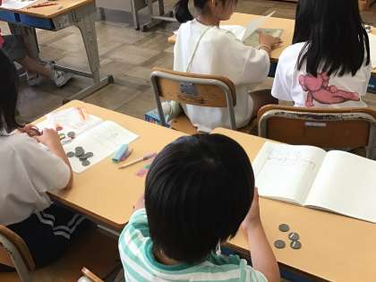 2年生算数では「100をこえる数」の学習をしています。今日は、100円で買い物をするときに、いくら払えばよいかを、算数セットのお金を使って考えました。