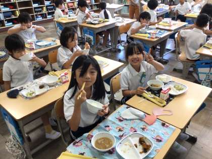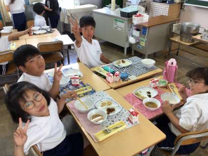 7/14 楽しい給食 公開日 2025/07/14 更新日 2025/07/14 特別活動 今日の献立はごはん、牛乳、レバーとカボチャの甘辛煮、えだまめサラダ、夏野菜のみそ汁です。 今日は夏野菜をたくさん使った献立です。 どれが夏野菜かな、と探しながら食べていました。