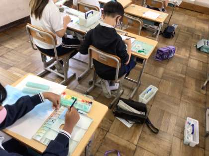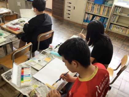 7/15 6年図工 公開日 2025/07/15 更新日 2025/07/15 各学年から 6年図工では、この筆あと どんな空? という作品づくりを始めていました。美術作品の筆あとや色使いを参考に自分なりの空を描くというものです。下書きがほぼできているので、今日は着色に入りました。どんな空になるのか楽しみですね。