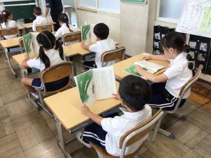 1年生国語では「大きなかぶ」の学習をしています。今日は、音読の練習をしました。おじいさん、おばあさん、孫、犬、猫、ねずみになりきって読むことができました。
