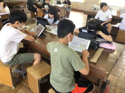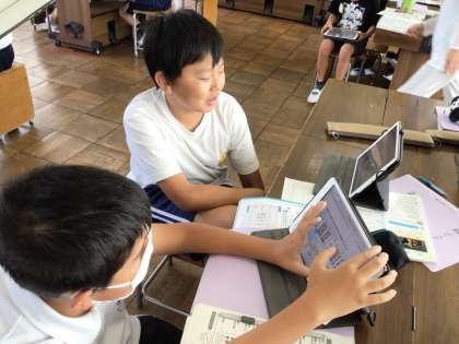 6年音楽では、イ短調の和音で旋律づくりをしています。タブレットを活用して音を入力して短い旋律をつくっていました。