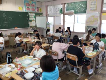 7/15 楽しい給食2 公開日 2025/07/15 更新日 2025/07/15 各学年から 友達と食べる給食は美味しいよね。どの学級も友達との会話を楽しみながら食べていました。今日も栄養バランスのとれた給食を食べて、暑さに負けないからだをつくっていきましょう。