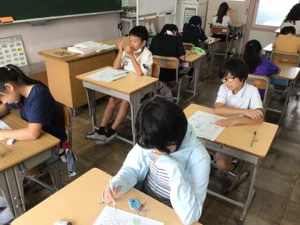 5年算数は、1組も2組も合同な図形の単元テストを実施していました。集中してテストに取り組んでいました。