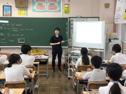 6年外国語では、ALTの先生と一緒に学習を進めていました。文字の音に慣れ親しもうのページを学習していました。
