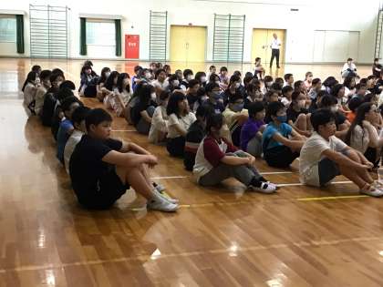 体育館に全校が集まって、夏休み前集会を行いました。校長先生のお話では、野球選手の吉見選手が心がけていることから「寝る前に今日あったいいことを3つ思い出そう。そうすることで脳が元気になる」というお話がありました。いいことを思い出して、体も心も脳も元気な夏休みを過ごしてください。