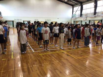 夏休みの生活について「正しく選べる夏休み」という話を聞きました。「してもいいこと」なのか「してはいけないこと」なのか自分で考えて、自分も周りの人も笑顔で過ごせる夏休みになるといいですね。最後に校歌を元気に歌いました。