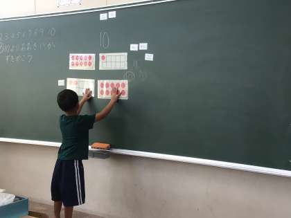 9/2 1年生算数 公開日 2025/09/02 更新日 2025/09/02 各学年から 1年生算数では、「10をこえるかず」の学習をしています。「11」はいくつといくつかを考えたり、発表したりしました。