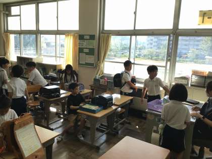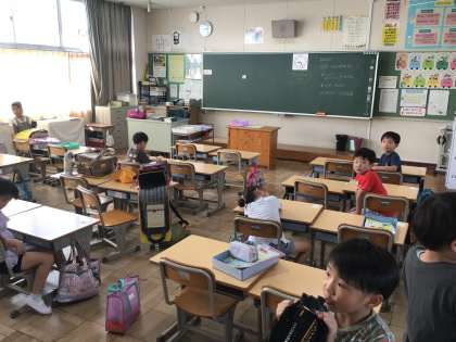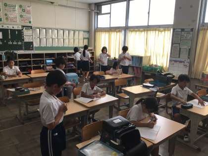 今日も汗を拭きながら元気よく登校してきました。教室に入ると翌日の連絡を記入し、授業の準備をしていました。1年生はプールがあるので、ウキウキした表情であいさつをしてくれました。