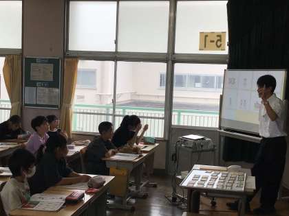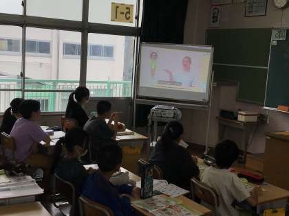 5年外国語では、He や She の意味や使い方について説明を聞いた後、「身近な人の紹介を聞きとろう」というめあてで学習を進めていました。映像を見ながらどのように紹介しているか、学習をしました。