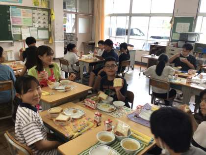 今日の献立はチキンナゲット、食パンにラフランスジャムでした。おかわりじゃんけんに燃える学級もあり、今日も楽しく会食をしていました。