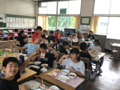 給食が始まって5日目、給食の準備や片付けも夏休み前同様にすばやくできるようになりました。どの教室も友達と会話をしながら、楽しく会食していました。