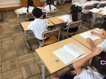 1年生国語ではカタカナの学習をしています。カタカナで伸ばす音「サッカー」「ゼリー」「ボール」などのカタカナをノートに書いて練習しました。
