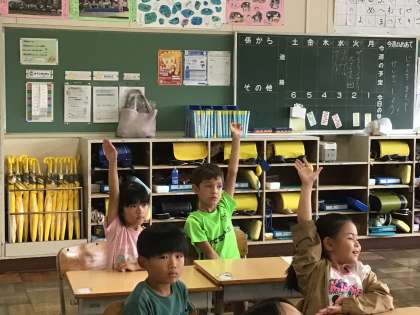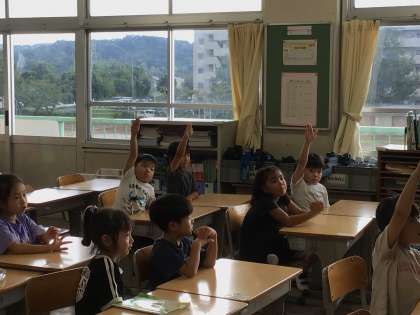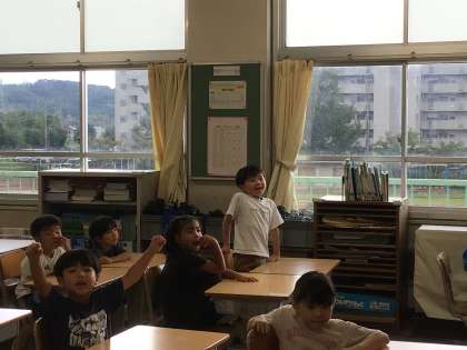 1年生国語では、「話したいな 聞きたいな」の学習をしています。今日は、夏休みに楽しかったこと、出かけたこと、頑張ったこと等を発表し、みんなに話ができるように書きました。