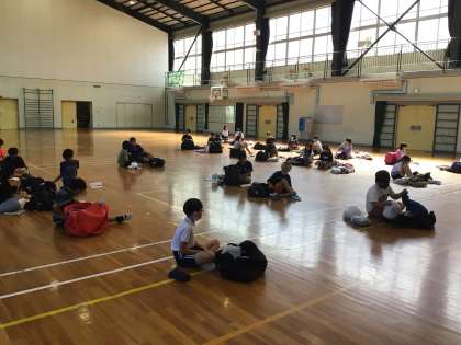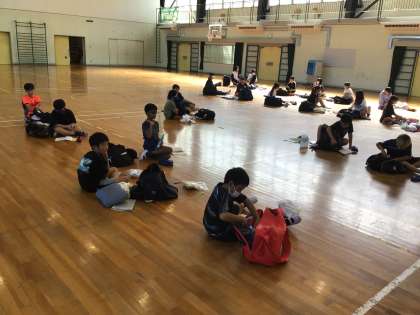 5年総合では、体育館でキャンプの荷物点検を行っていました。着替えだけでなく、係で必要なものもあるので、先生の指示を聞いて静かに荷物点検を行っていました。