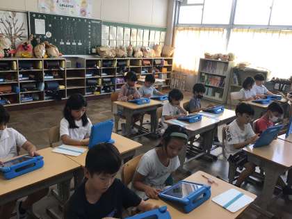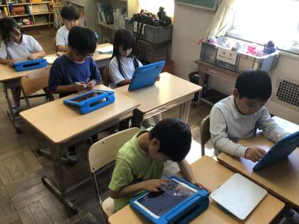 2年生活では、生きものはっけんという単元を学んでいます。「ものすごい図かん」というソフトを使って、1つ調べたいものを選び、学習用タブレットの画像をよく見ながら絵をかいていました。